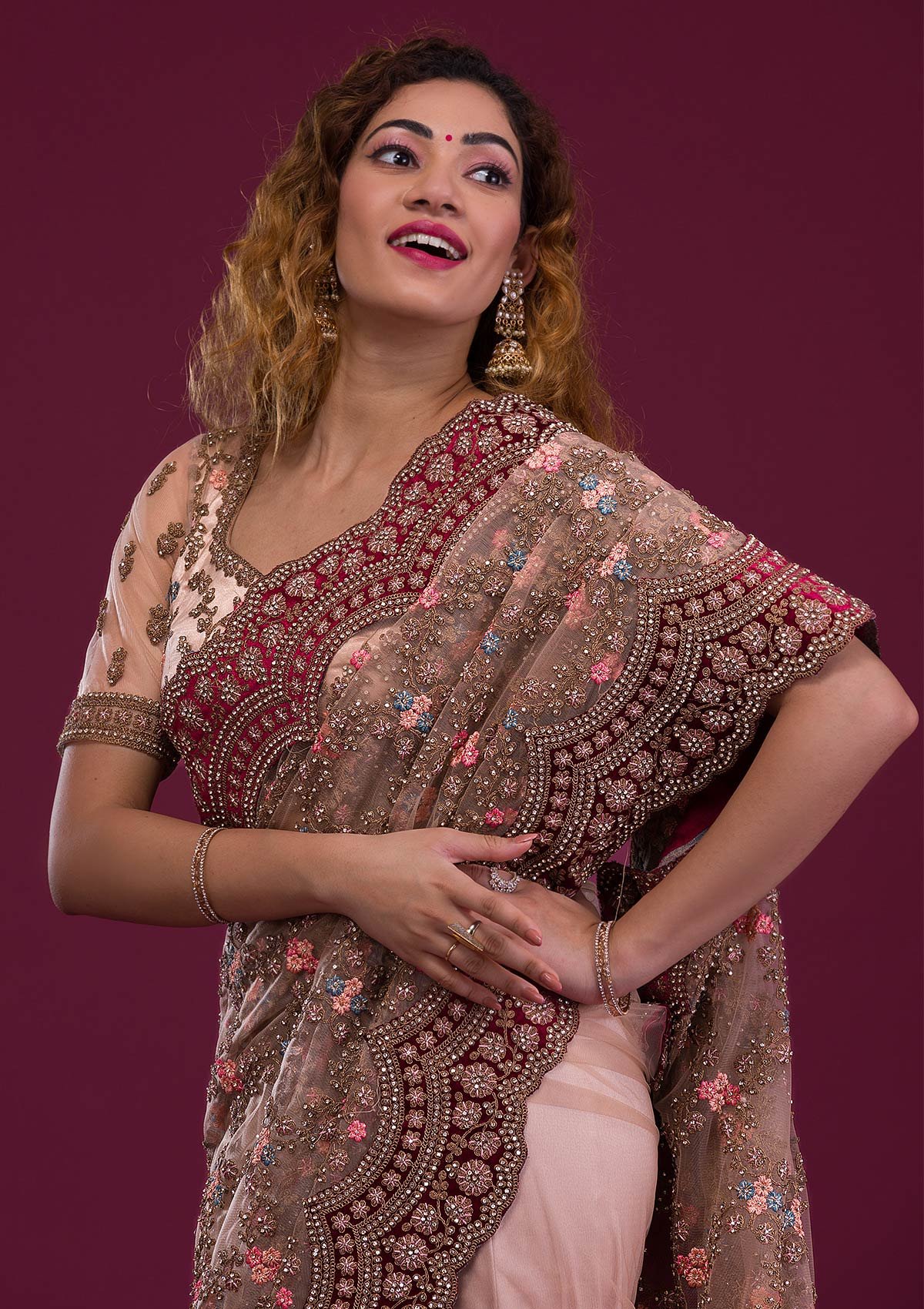 – The Saree is elevated with Stonework embroidery