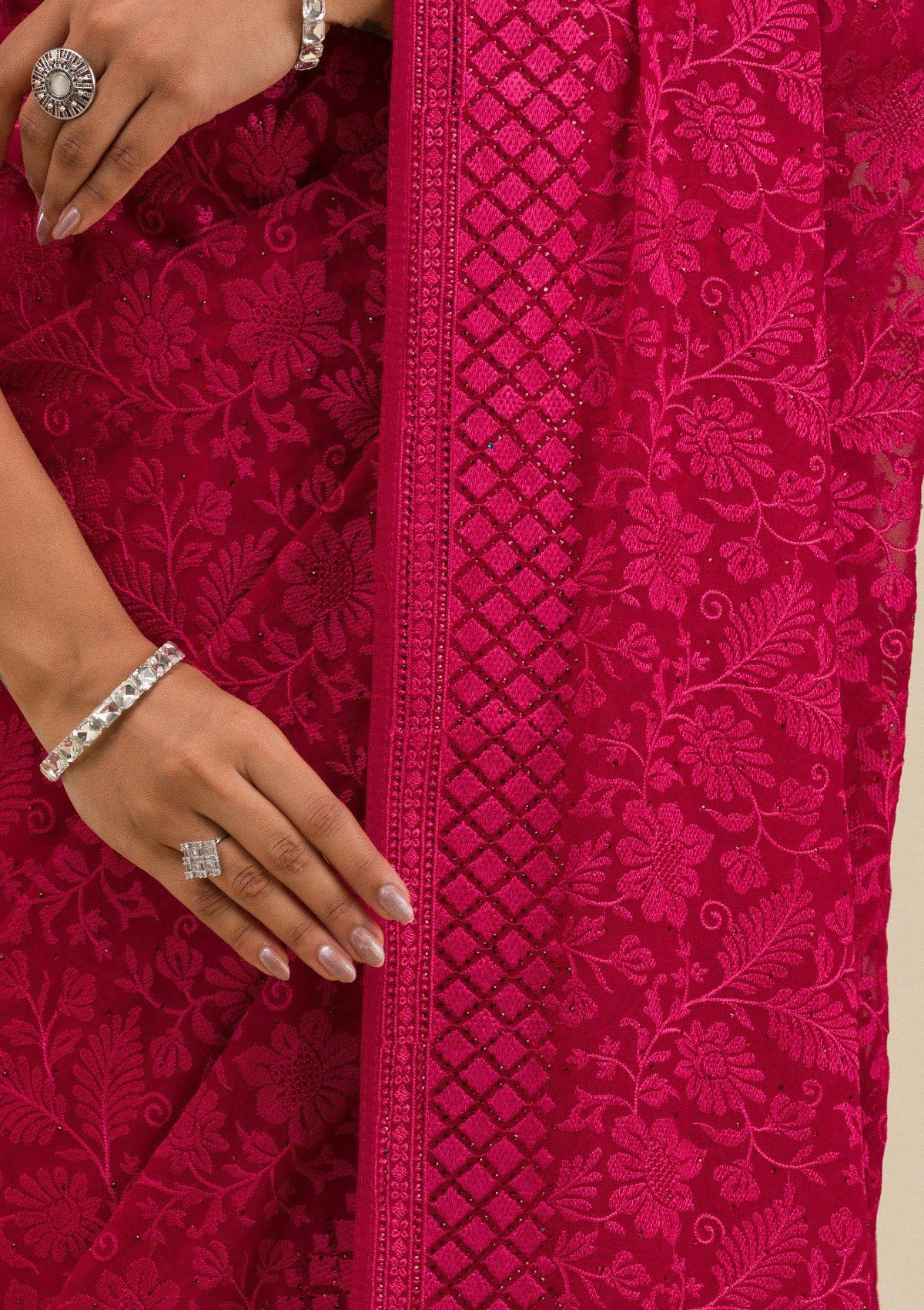 – The Saree is elevated with Threadwork embroidery