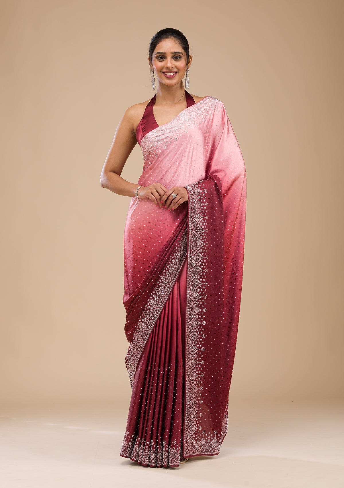 Elegant Maroon Satin Saree with Exquisite Stonework