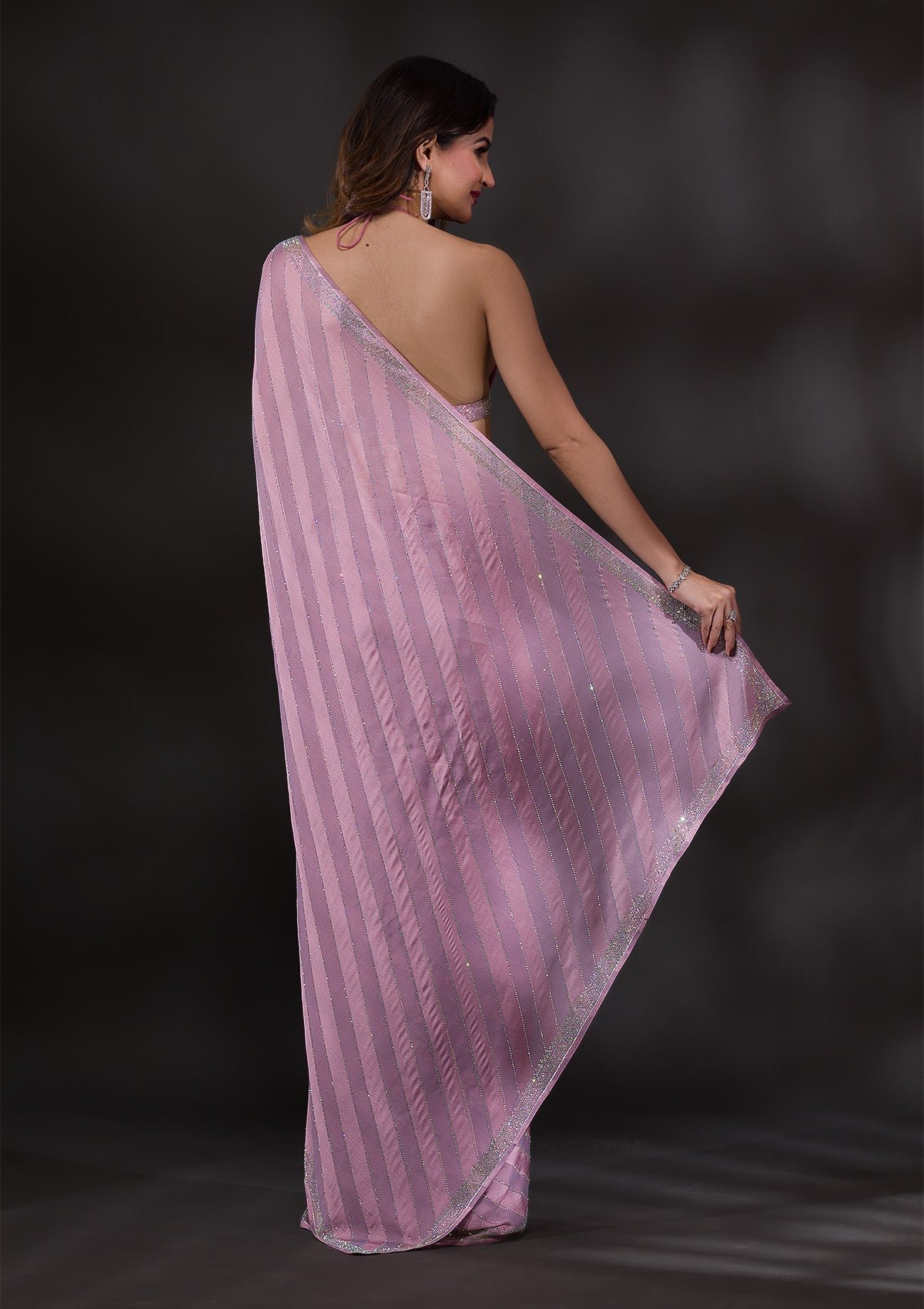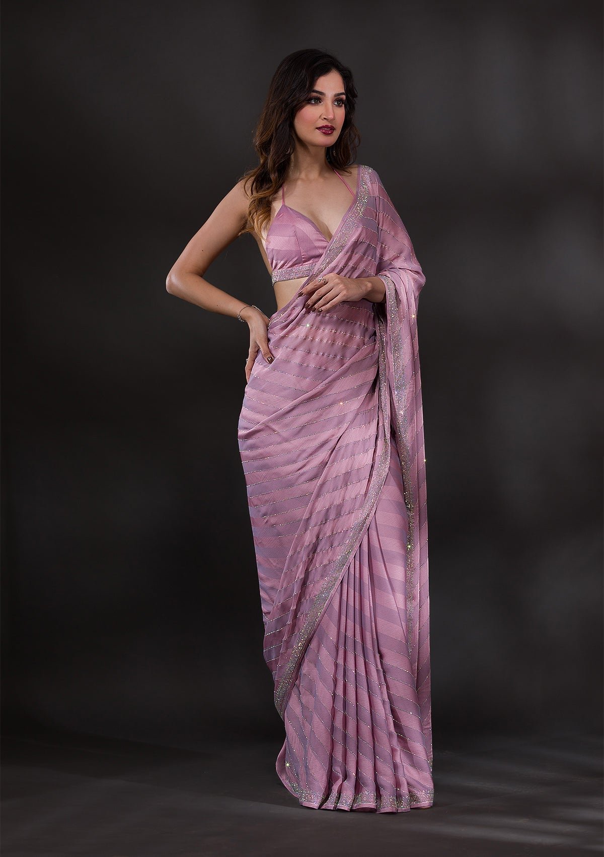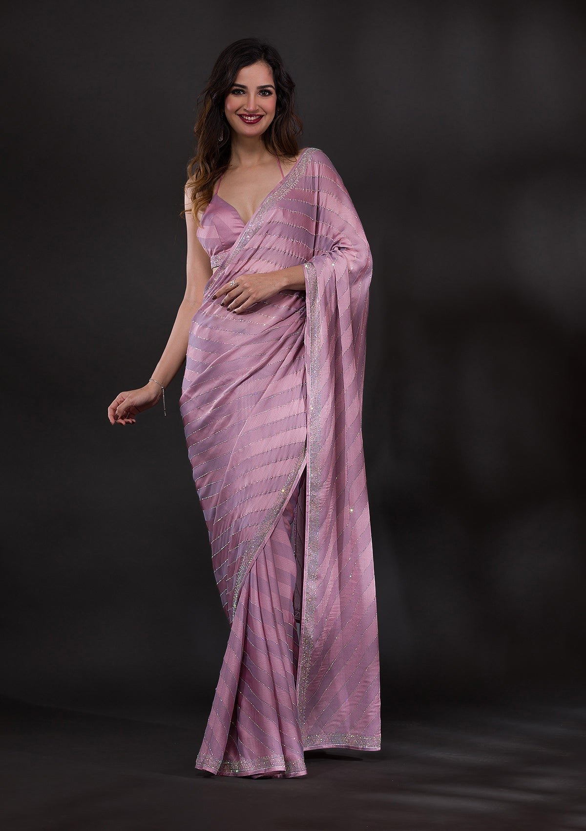 Elegant Mauve Swarovski-Embellished Satin Designer Saree