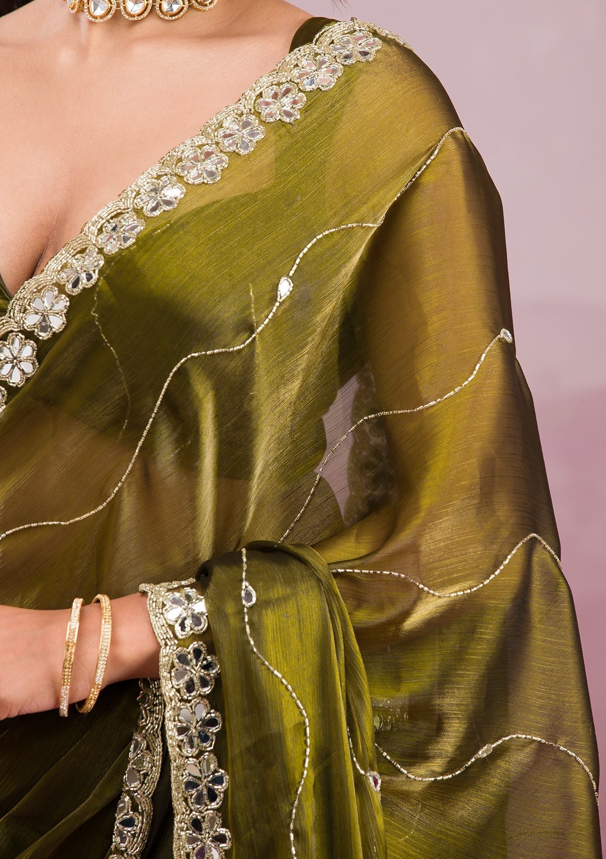 – The Saree is elevated with Mirrorwork embroidery
