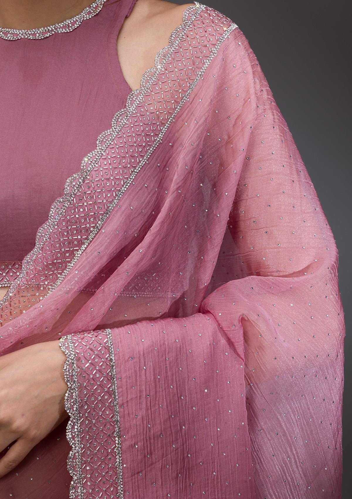 – The Saree is elevated with Stonework embroidery
