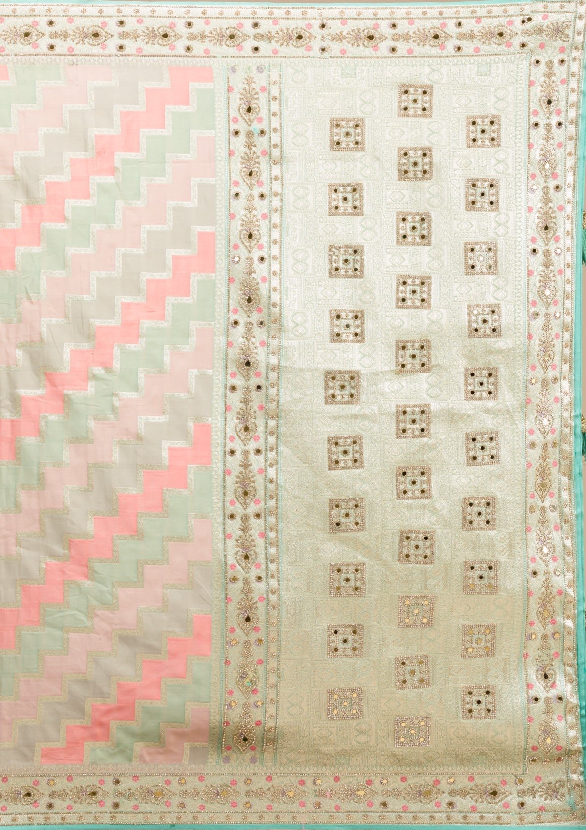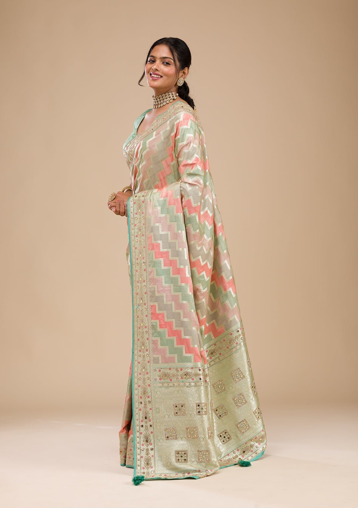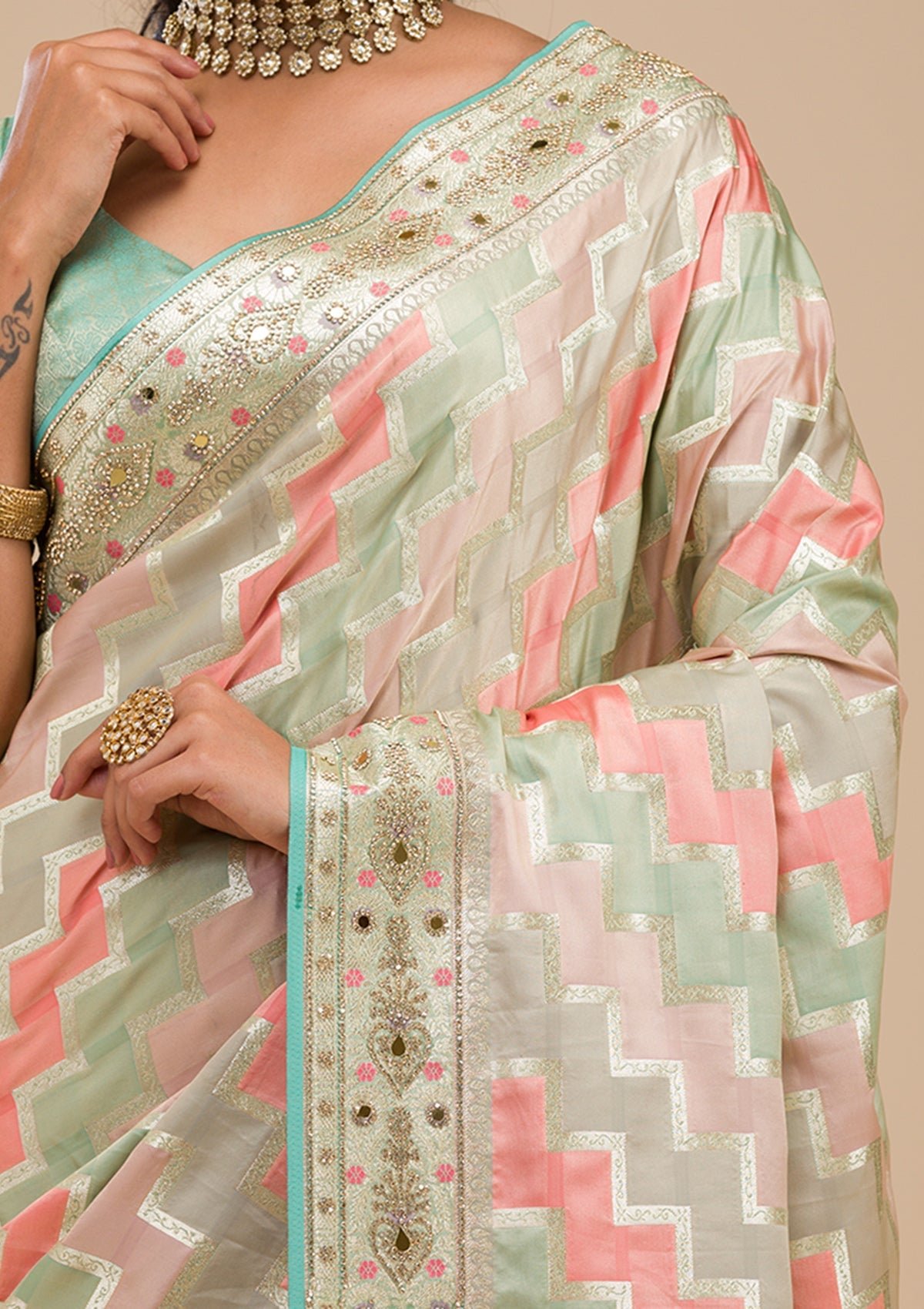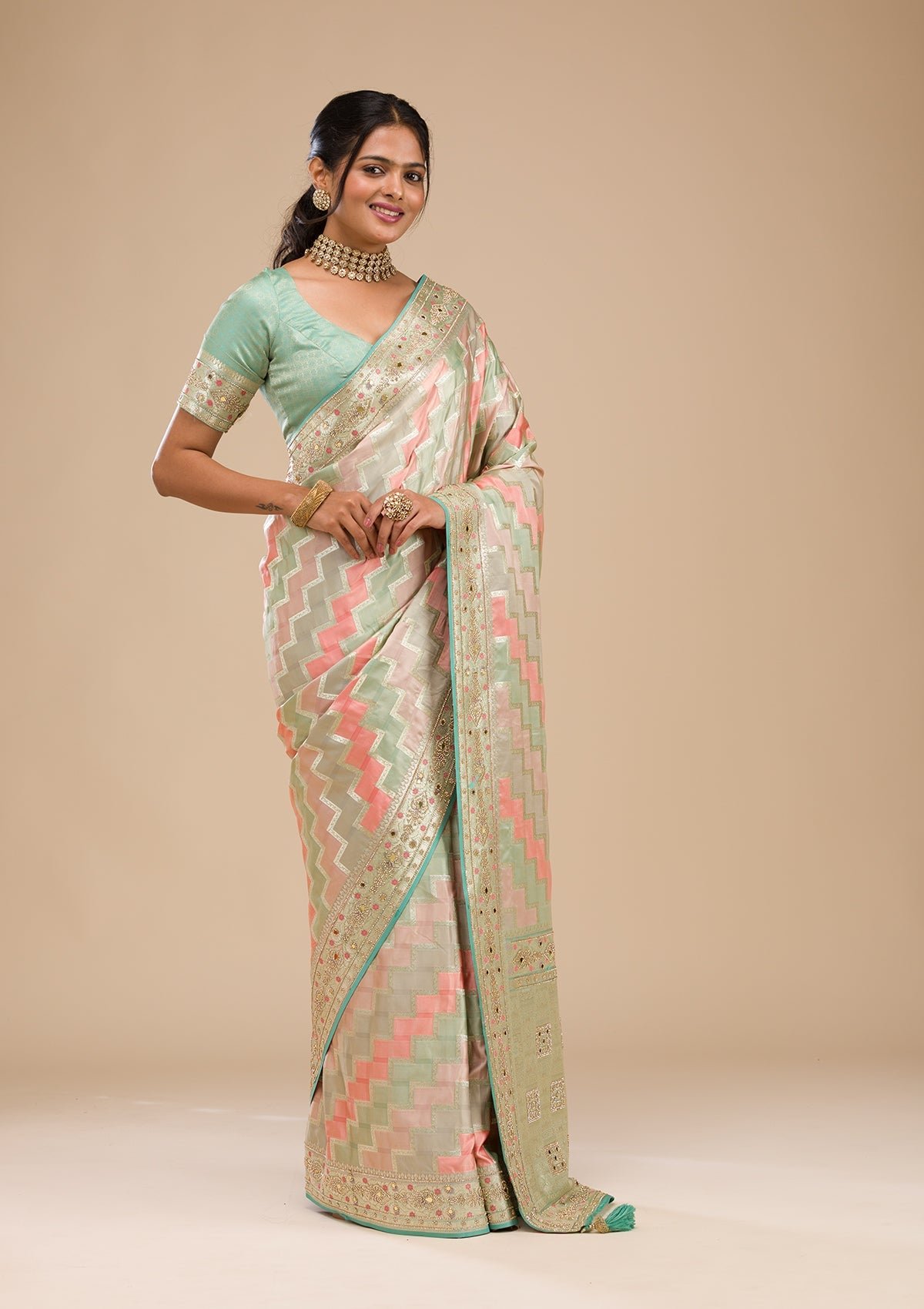 – The Saree is elevated with Stonework embroidery