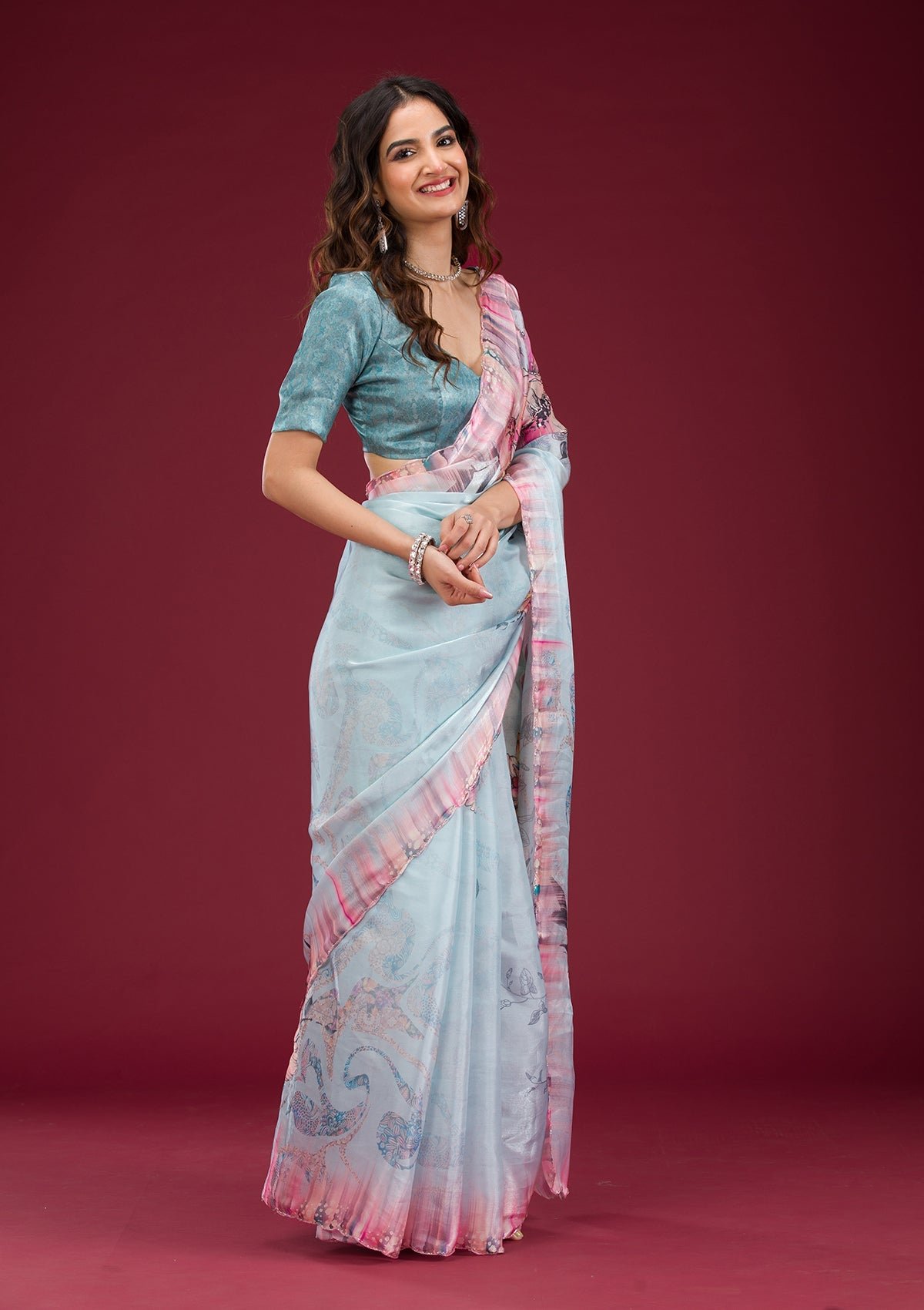 – Sky Blue Saree in Tissue fabric