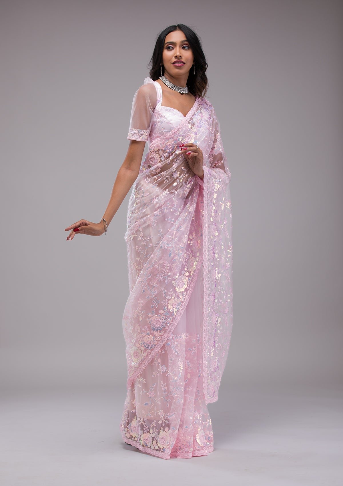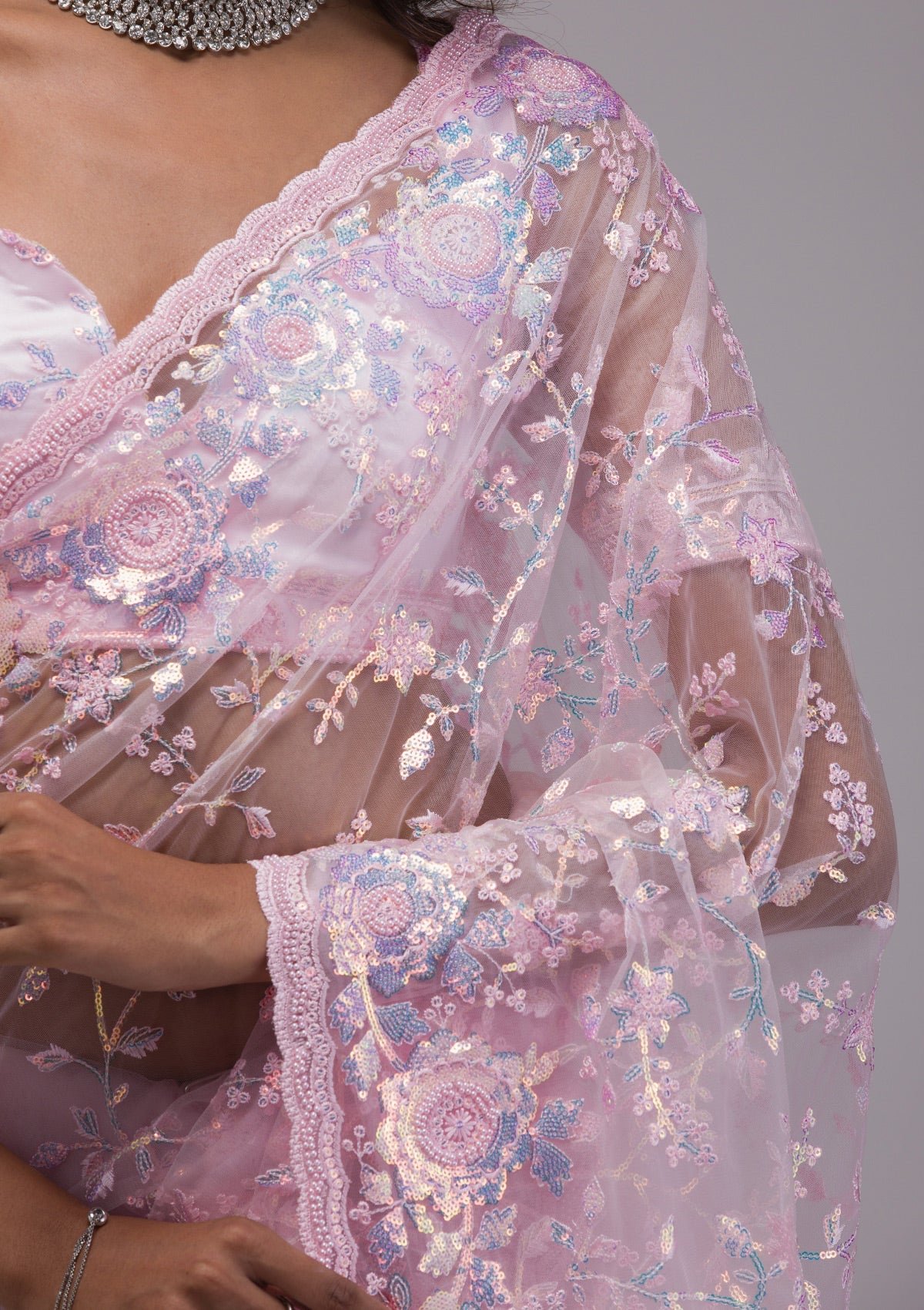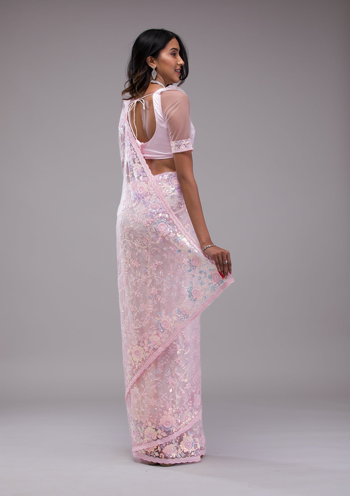 Glamorous Baby Pink Sequin-Embellished Tissue Saree