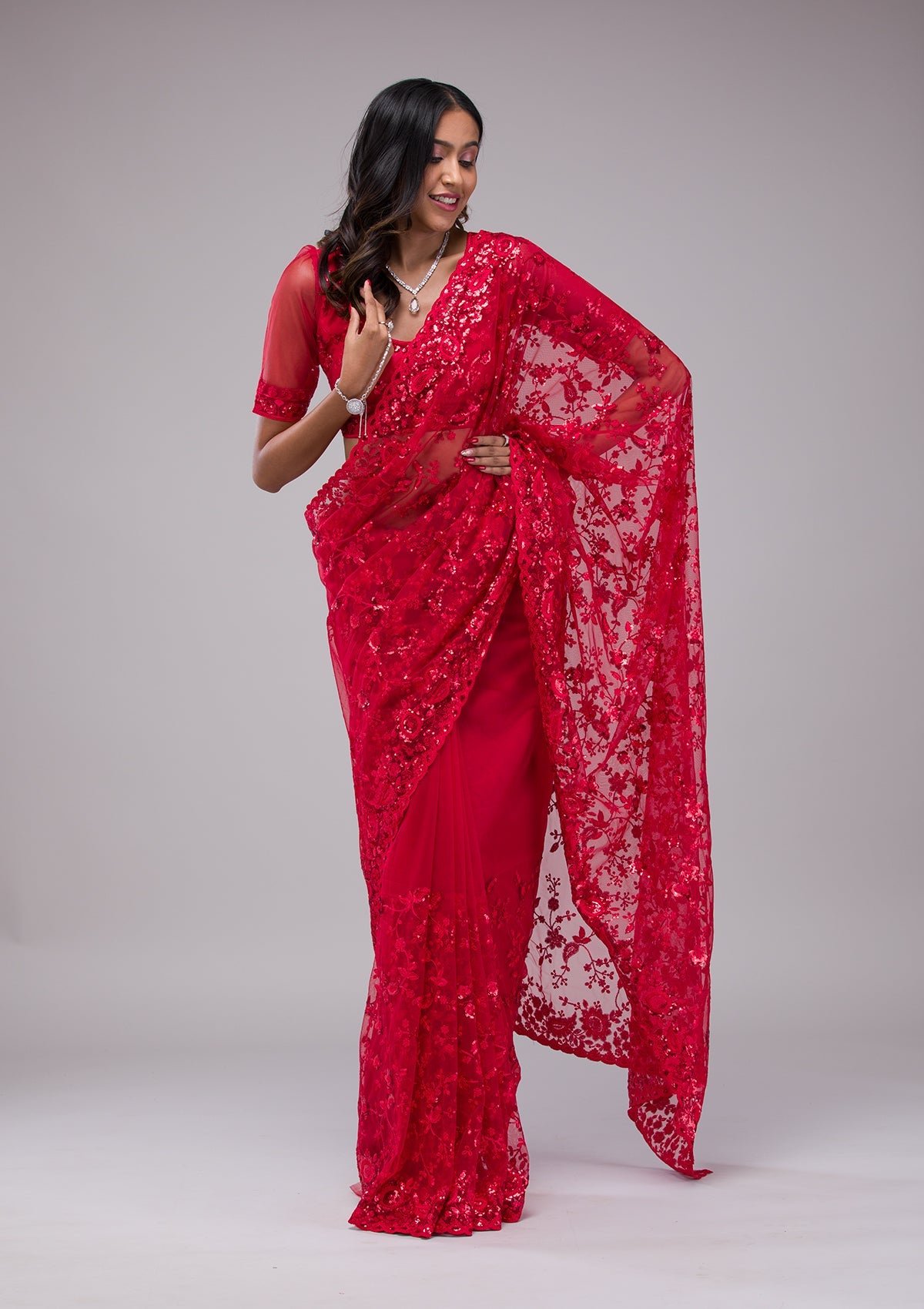 – Red Saree in Net fabric